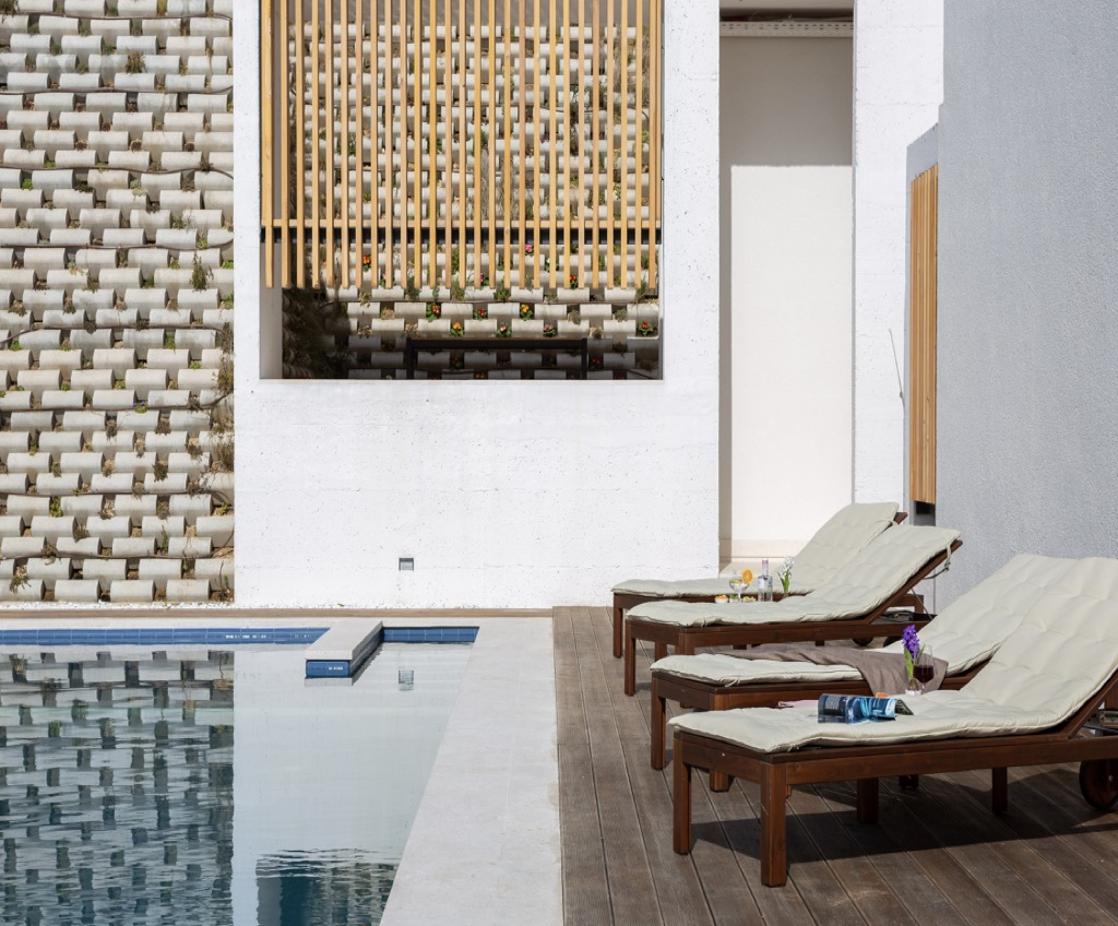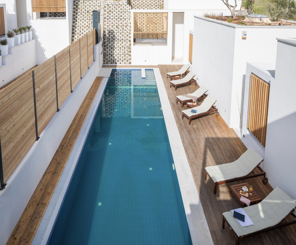 Tyto bazény jsou obklopeny lehátky a svěží zelení a představují ideální místo pro relaxaci a odpočinek při slunění ve Středomoří.