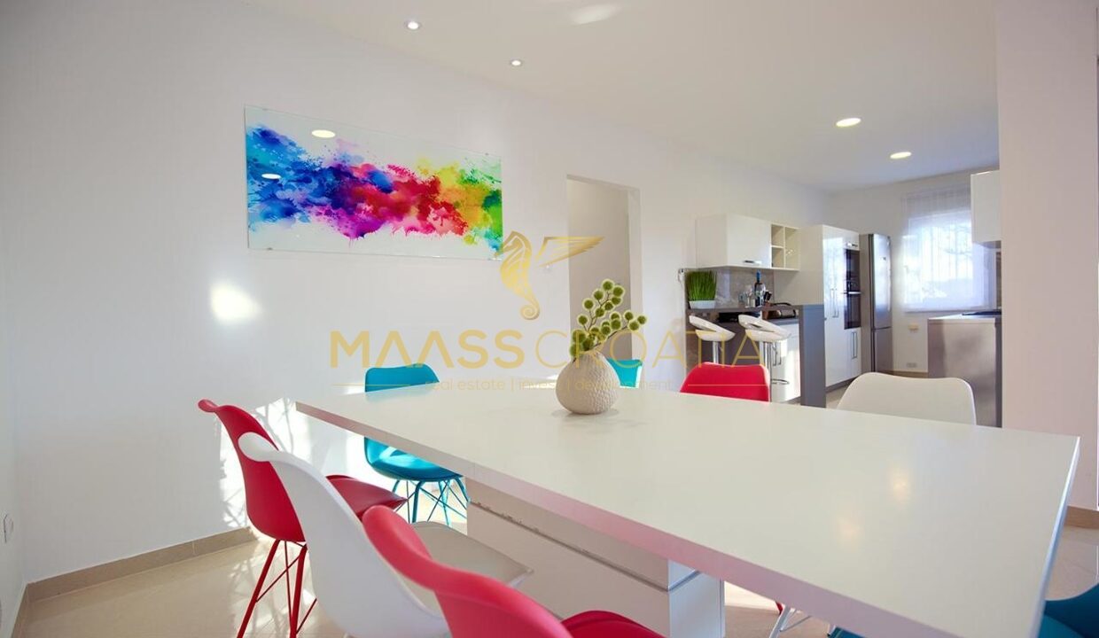 Vnitřní schodiště vede do horního bytu o celkové ploše 110 m2 a skládá se z velkého obývacího pokoje, kuchyně s jídelnou, tří ložnic, tří koupelen a dvou teras.