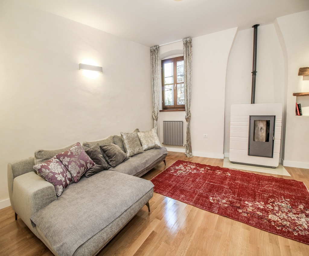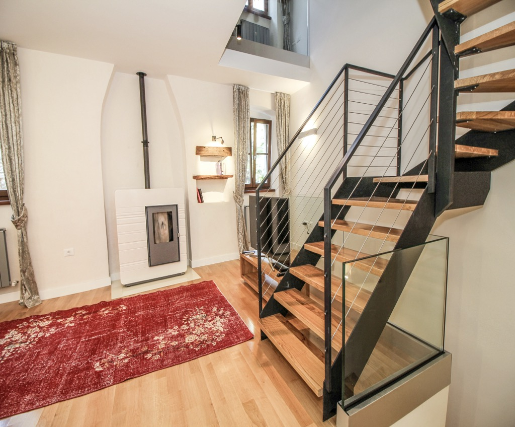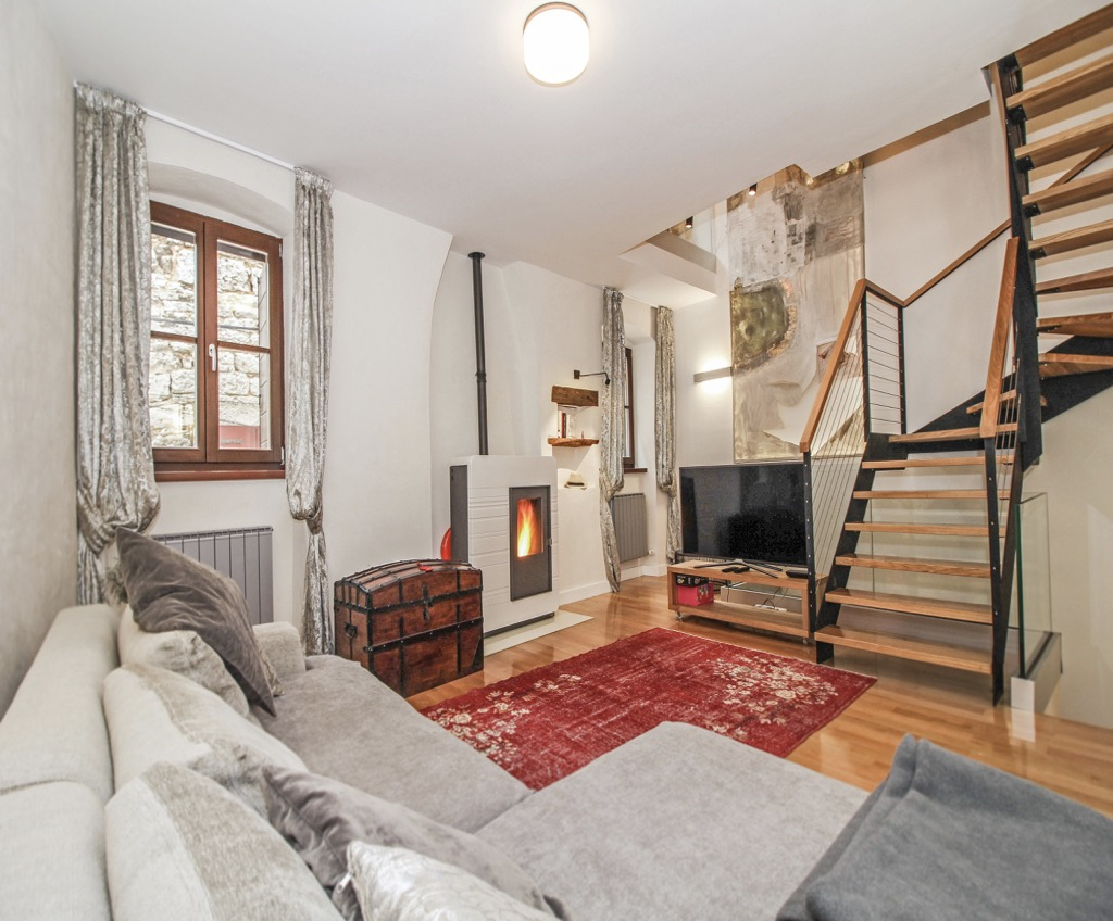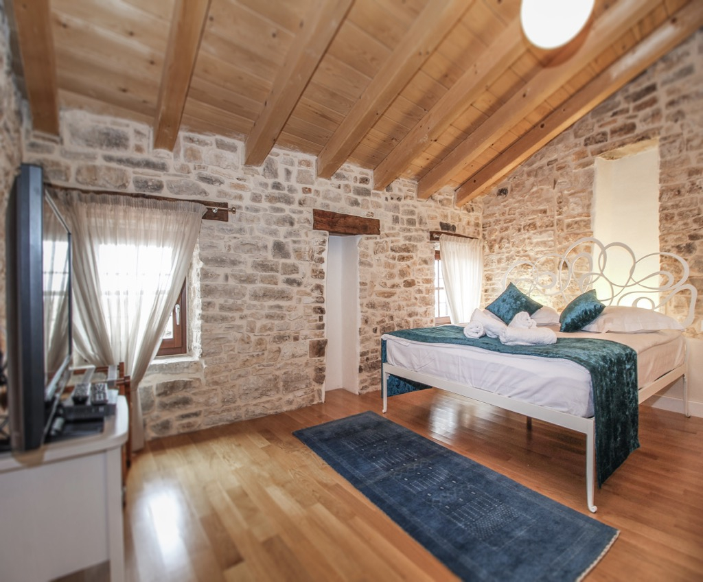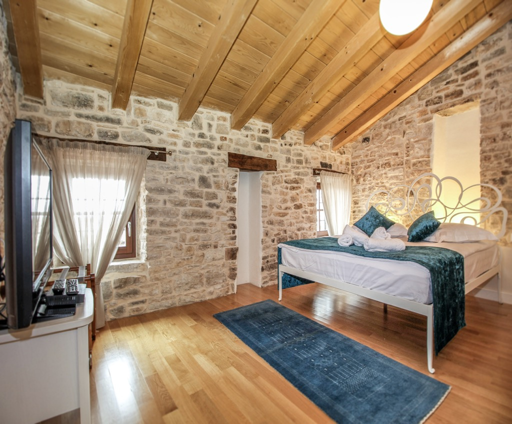 Detaily, jako jsou kamenné zdi, dřevěné podlahy a dřevěné trámy ve střešní části, dodávají tomuto domu charakter regionu.