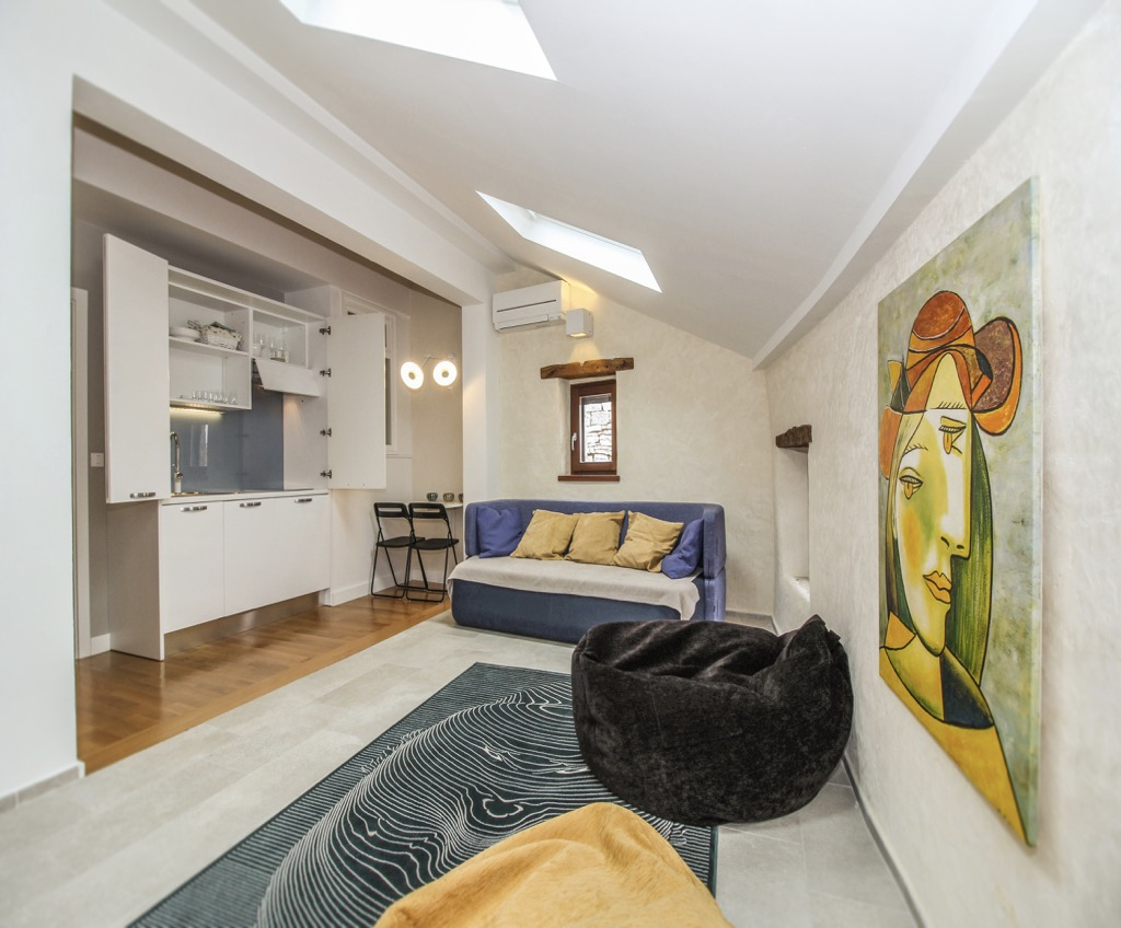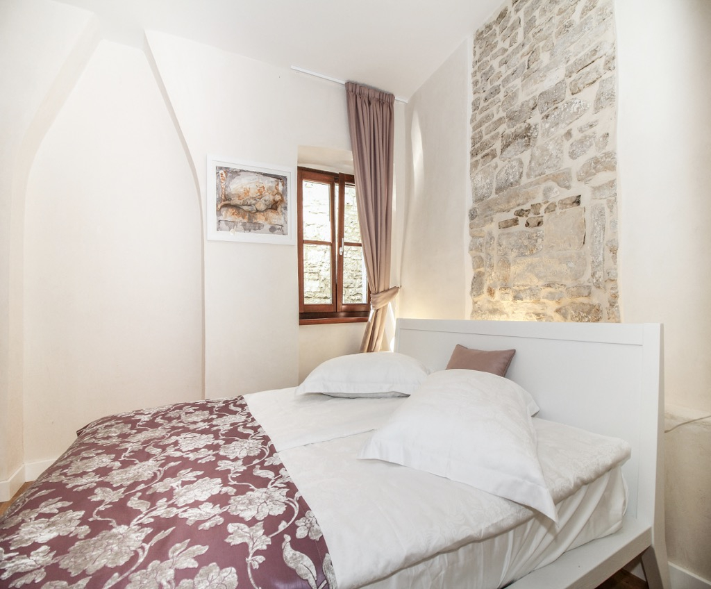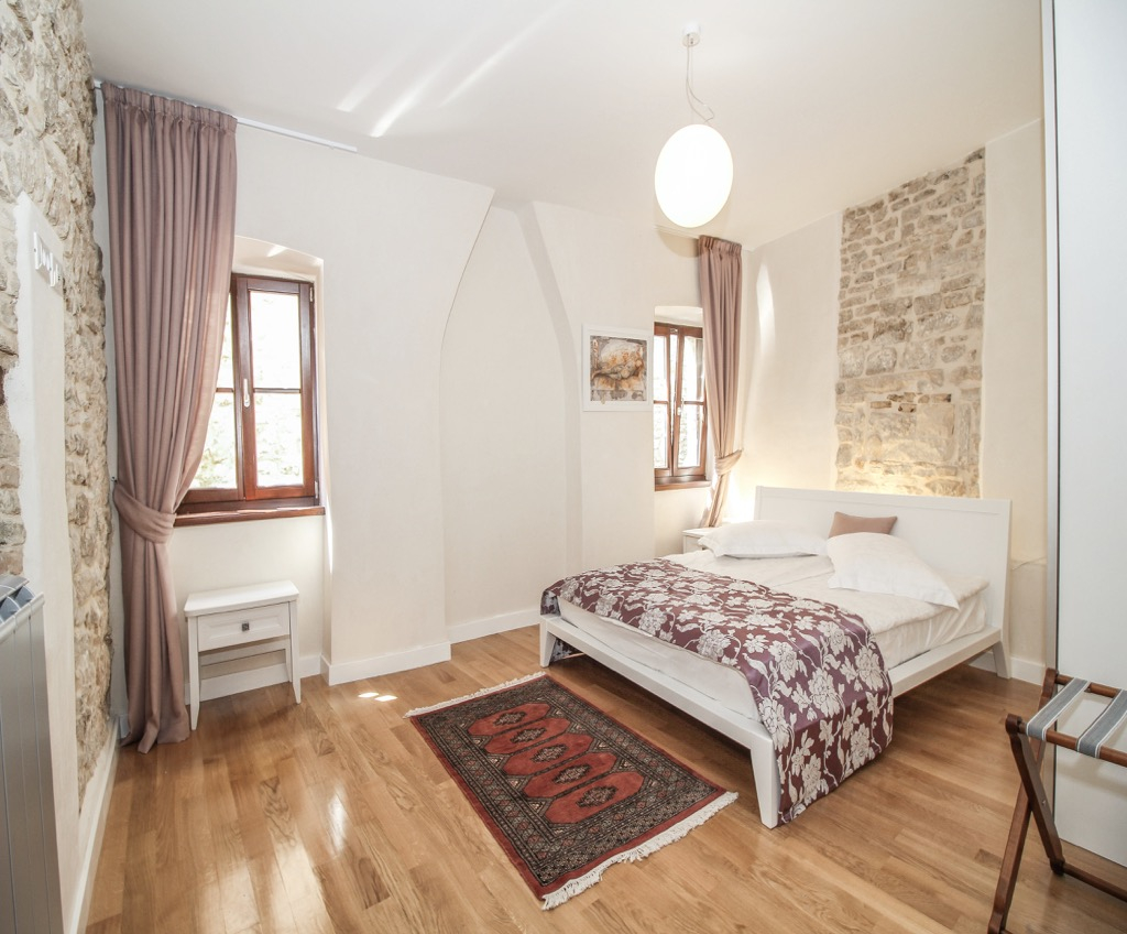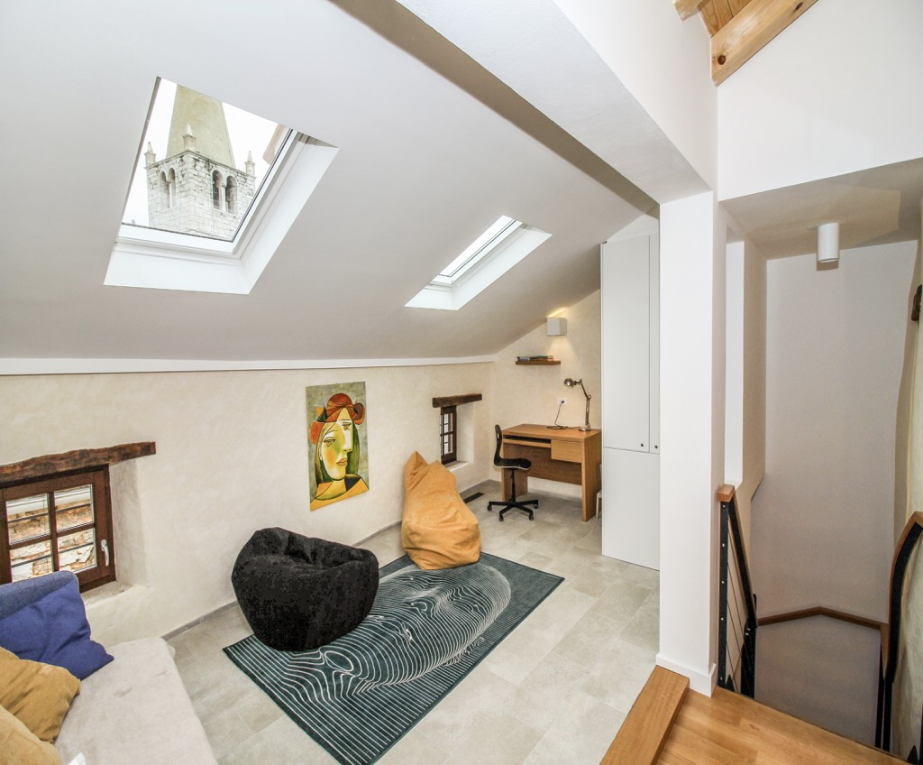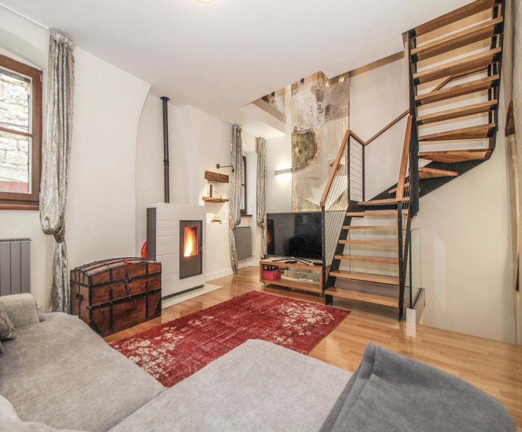 Detaily, jako jsou kamenné zdi, dřevěné podlahy a dřevěné trámy ve střešní části, dodávají tomuto domu charakter regionu.