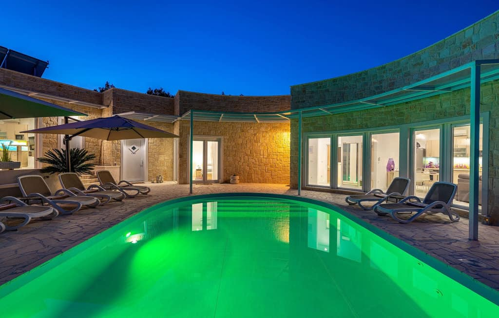 Elegantní a moderní interiér je doplněn vysoce kvalitním vybavením, jako je bazén o rozloze 40 m2, který je ideální pro osvěžující koupání v horkých letních dnech.