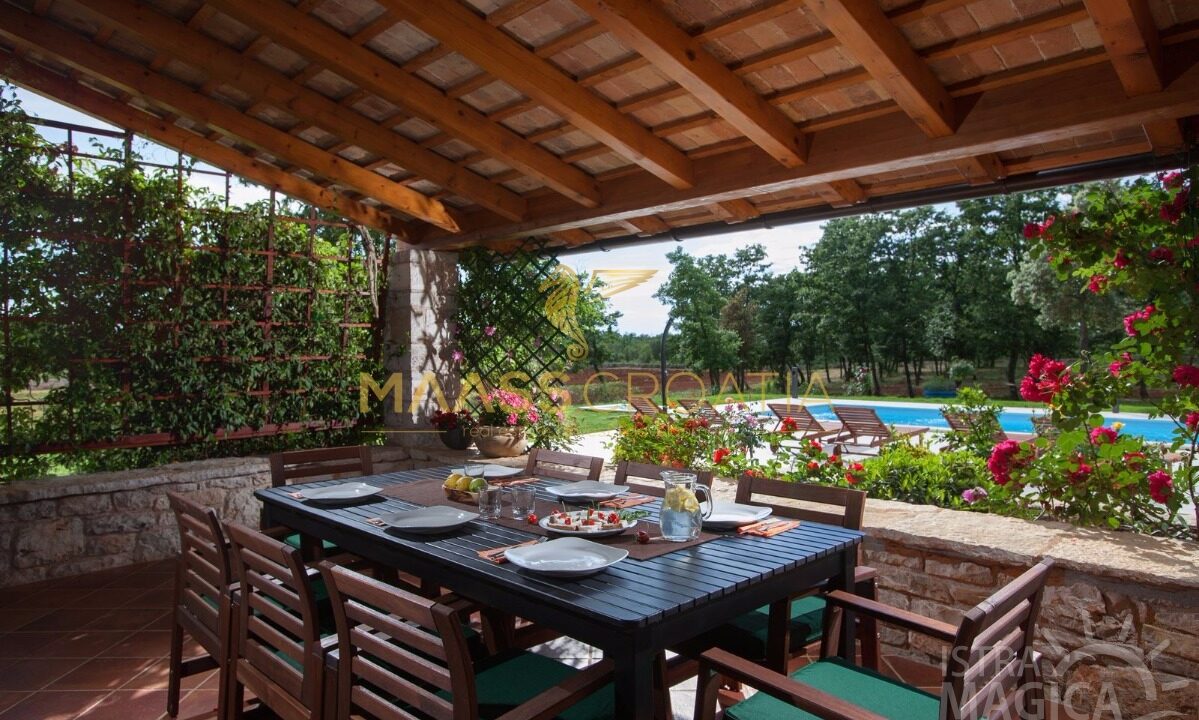 Nemovitost tvoří jednopatrový kamenný dům s krytou terasou zastíněnou pergolou – ideální pro vychutnávání klidu a výhledů na okolní krajinu.