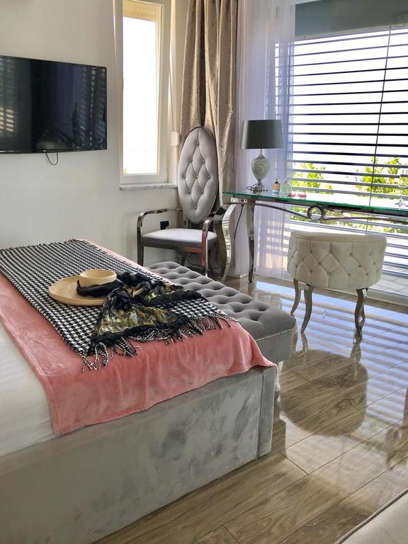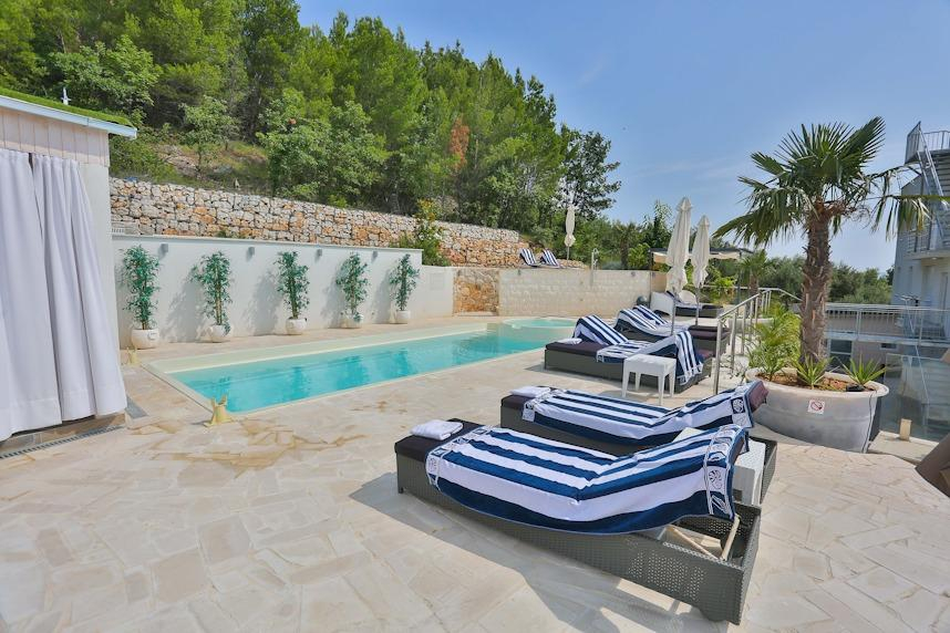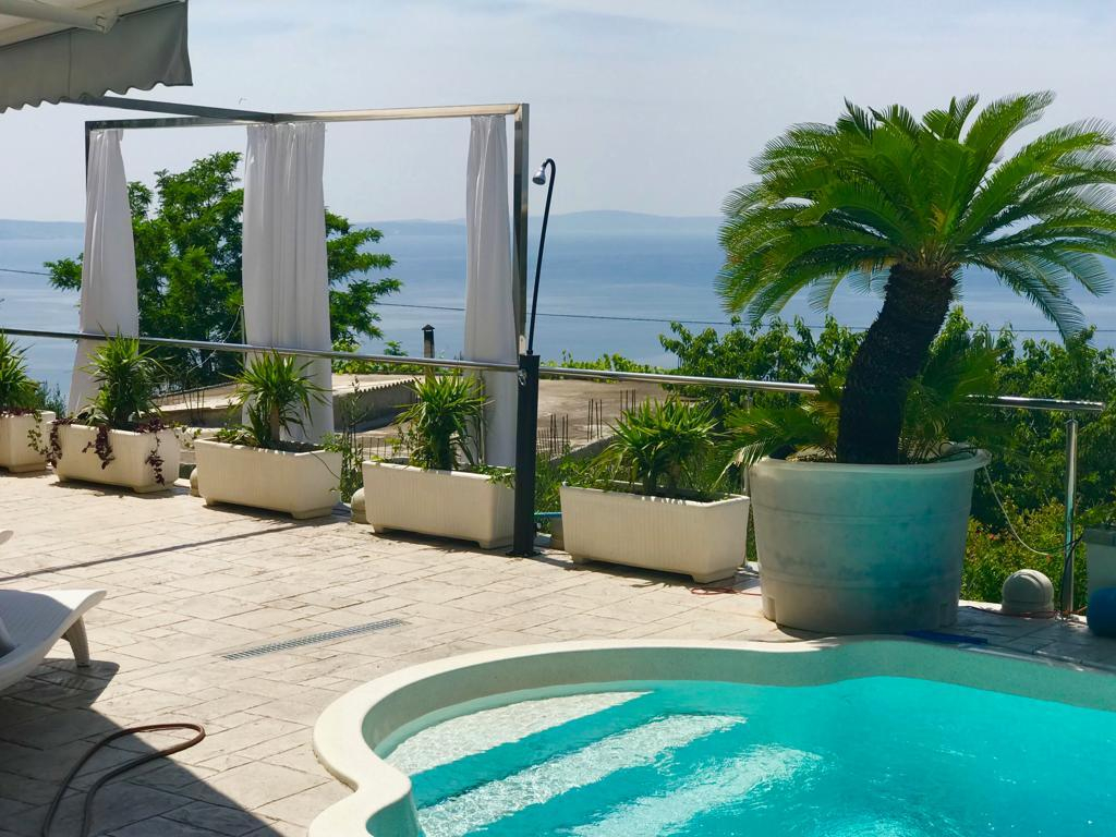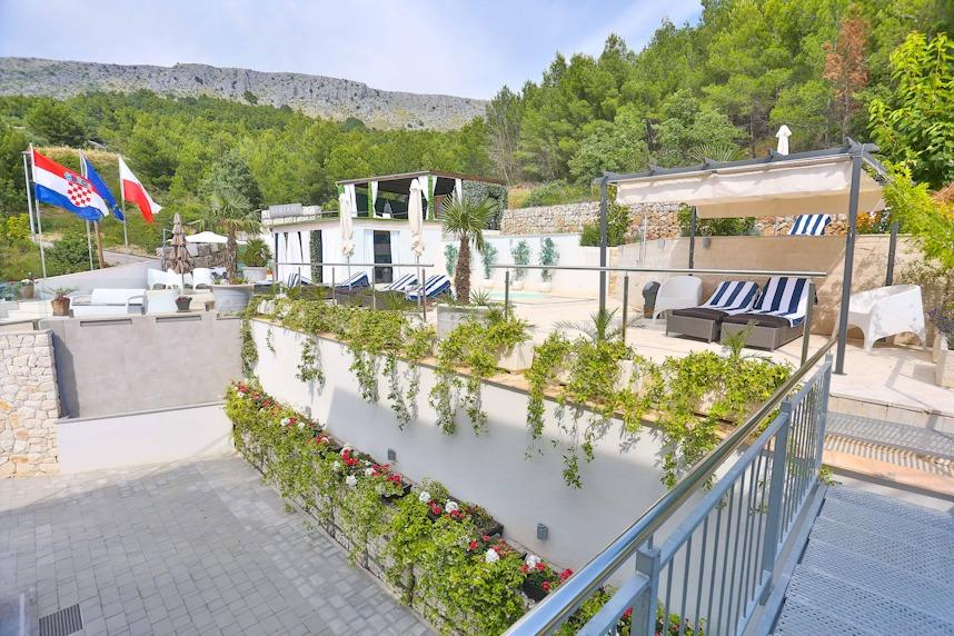 Na horní terase se nachází vířivka se saunou v odpočinkové zóně ve tvaru pergoly, odkud je nádherný výhled na centrum Splitu a krajinu v pozadí. Interiér je zařízen luxusně, s mramorem a vysoce kvalitními materiály. Dům je opravdu zařízen co nejluxusněji, i do vybavení jsme zakomponovali některé kvalitní materiály a spotřebiče. Prostorný interiér je dobrou kombinací eklektického a moderního stylu, což vilu skutečně vystihuje jako sofistikovaný domov s lehkou atmosférou. Dům má dva velké balkony, na které je přístup z obou ložnic a ze kterých si můžete vychutnávat úchvatné západy slunce nad zálivem a blízkými ostrovy. Na příjezdové cestě je 5 velkých parkovacích míst pro vaše auta. K dispozici je malá část zahrady, která je využívána především k estetickým účelům, ale také malá část místní vegetace, která přináší veselé barvy do převážně bílo-modré estetiky. Celkově je toto místo ideální pro ty, kteří hledají místo s dostatkem prostoru pro zábavu. Je to ideální domov také pro každého, kdo hledá vzrušující dovolenou mimo domov.