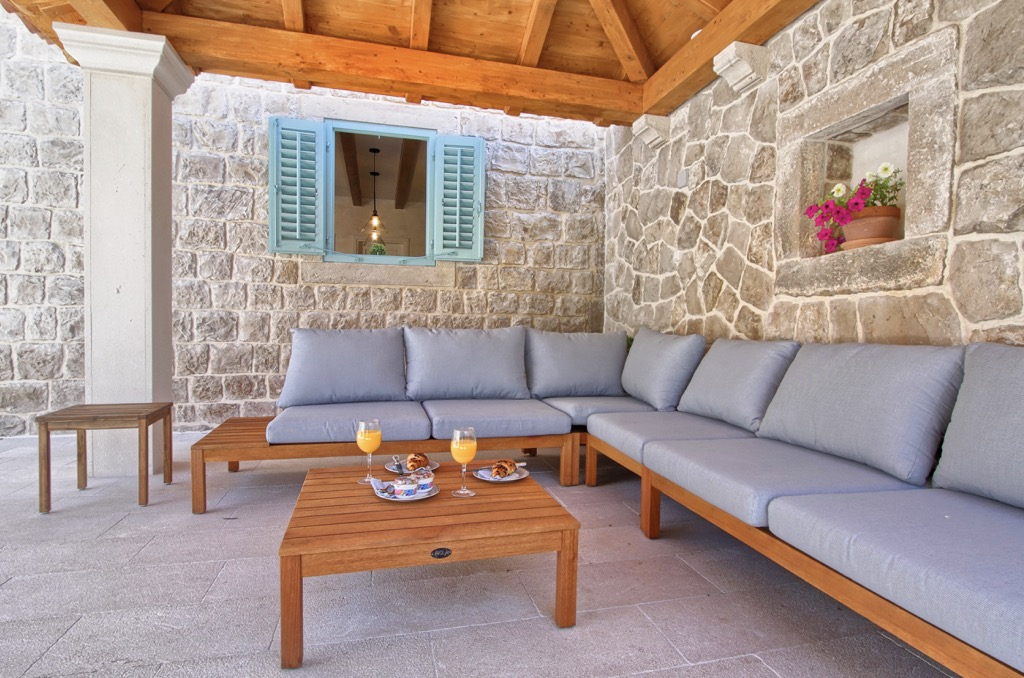 Interiér je velmi elegantní a zdobený kamenem na stěnách a podlahách i dřevěnými materiály, jako jsou dřevěné trámy pod střechou. To dodává celému domu útulnou a hřejivou atmosféru a vy se zde budete okamžitě cítit jako doma.