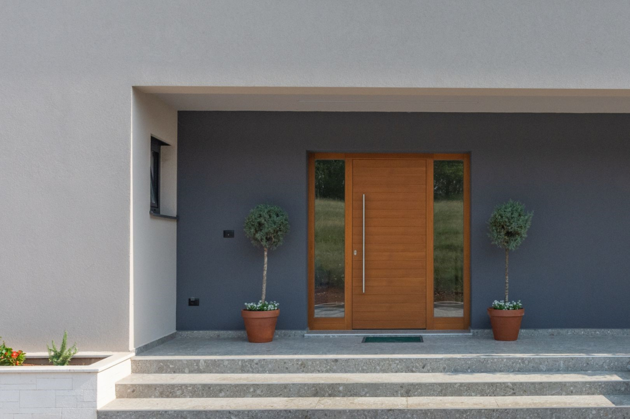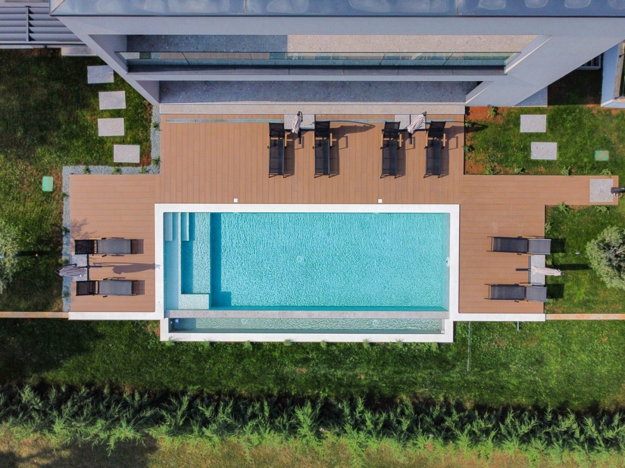 Tato moderní vila byla postavena v roce 2022 a nabízí dokonalou kombinaci moderního designu a tradičního šarmu.