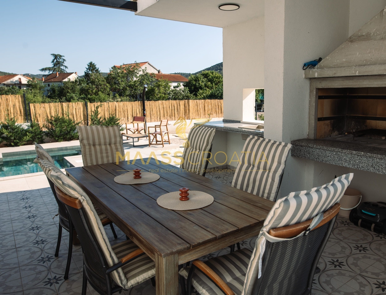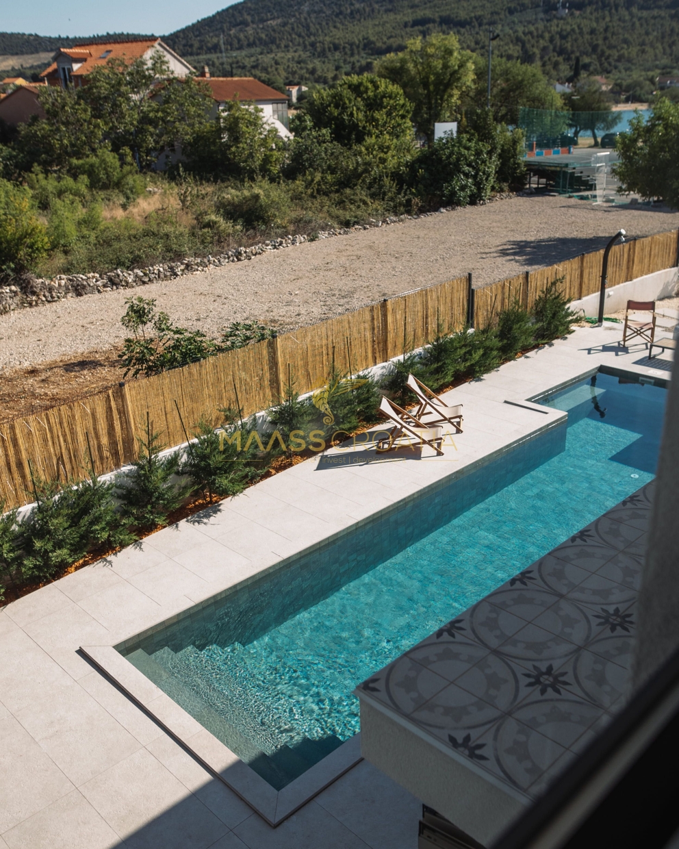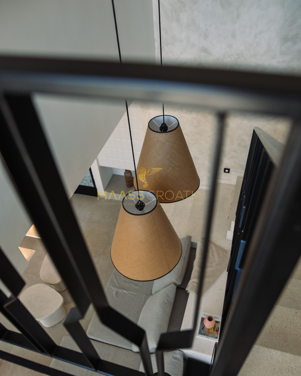 V klidné a mimořádně atraktivní lokalitě, přímo na břehu Prokljanského jezera v Bilicích u Šibeniku, se nachází moderní luxusní vila s obytnou plochou 200 m².