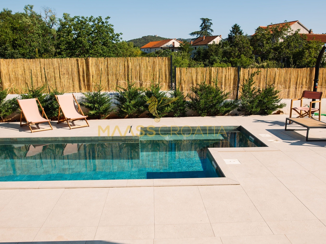 Venku se nachází soukromý bazén s udržovanou sluneční terasou, krytá letní kuchyně s grilem a několik parkovacích míst.