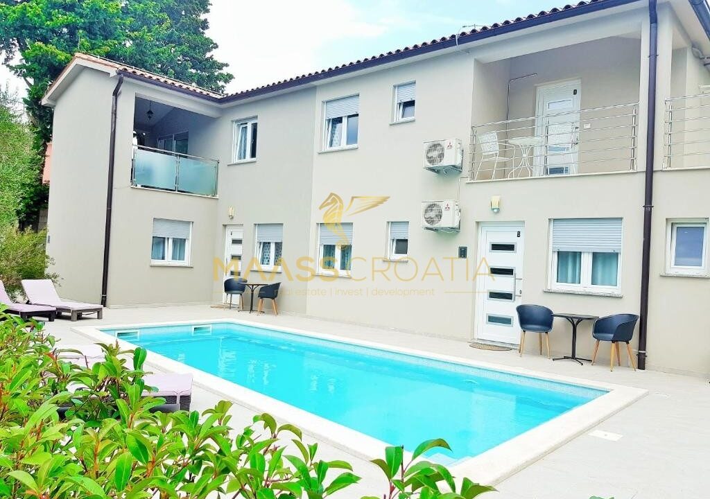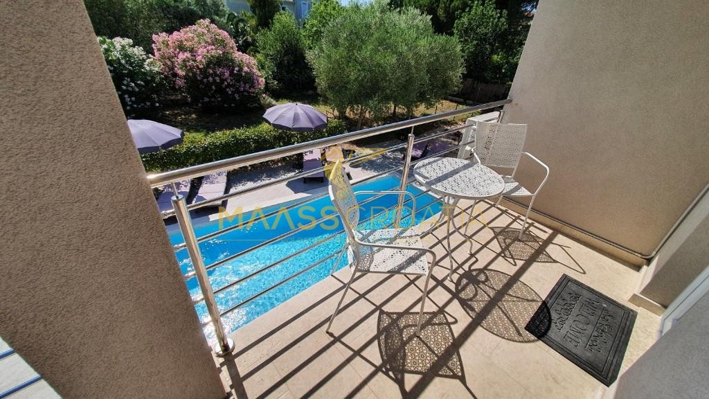 Byty v přízemí mají přímý přístup k bazénu, sluneční terase a upravené zahradě, zatímco horní byty mají prostorné terasy.
