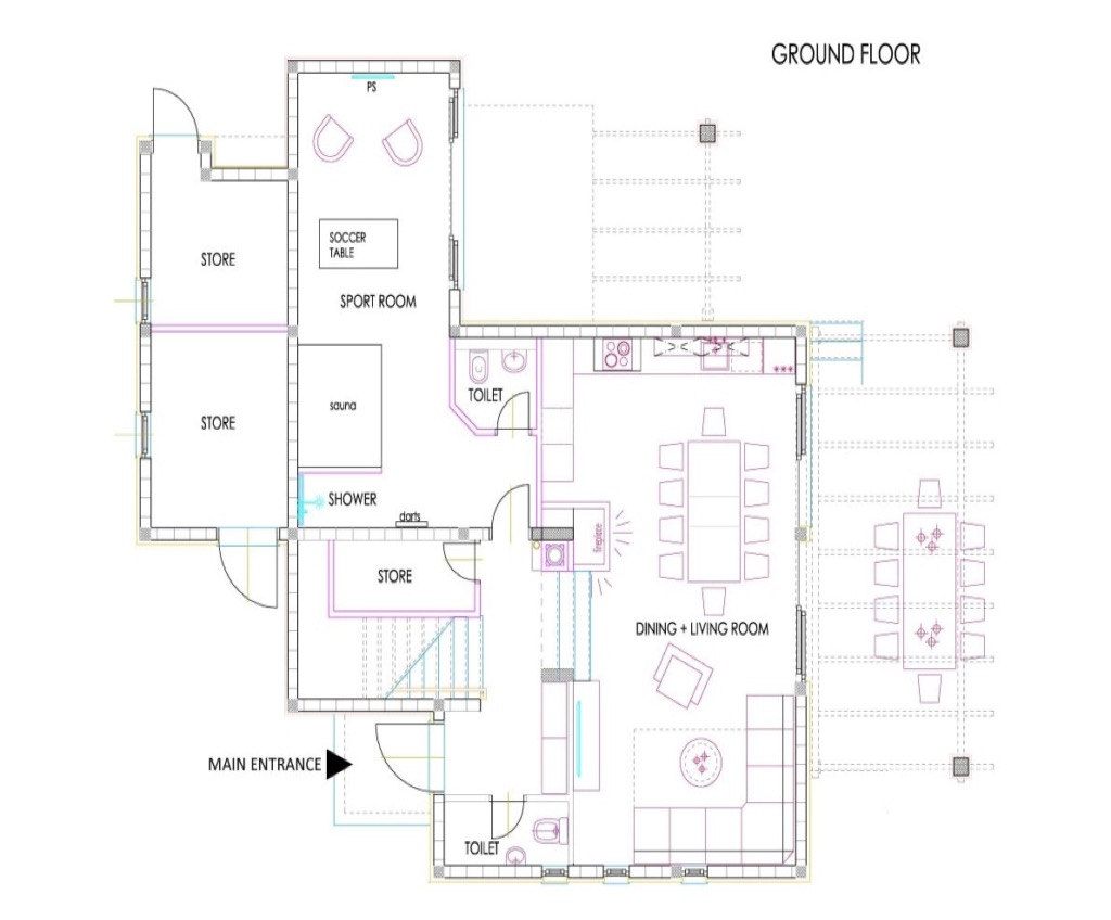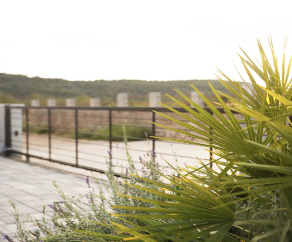 Ta je strategicky oddělena od bazénu a zbytku venkovního prostoru malou částí rostlinného materiálu, aby poskytovala soukromí a vytvářela jinou zónu pro zábavu než hlavní terasa.