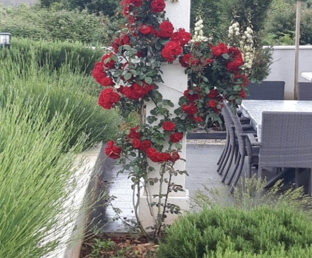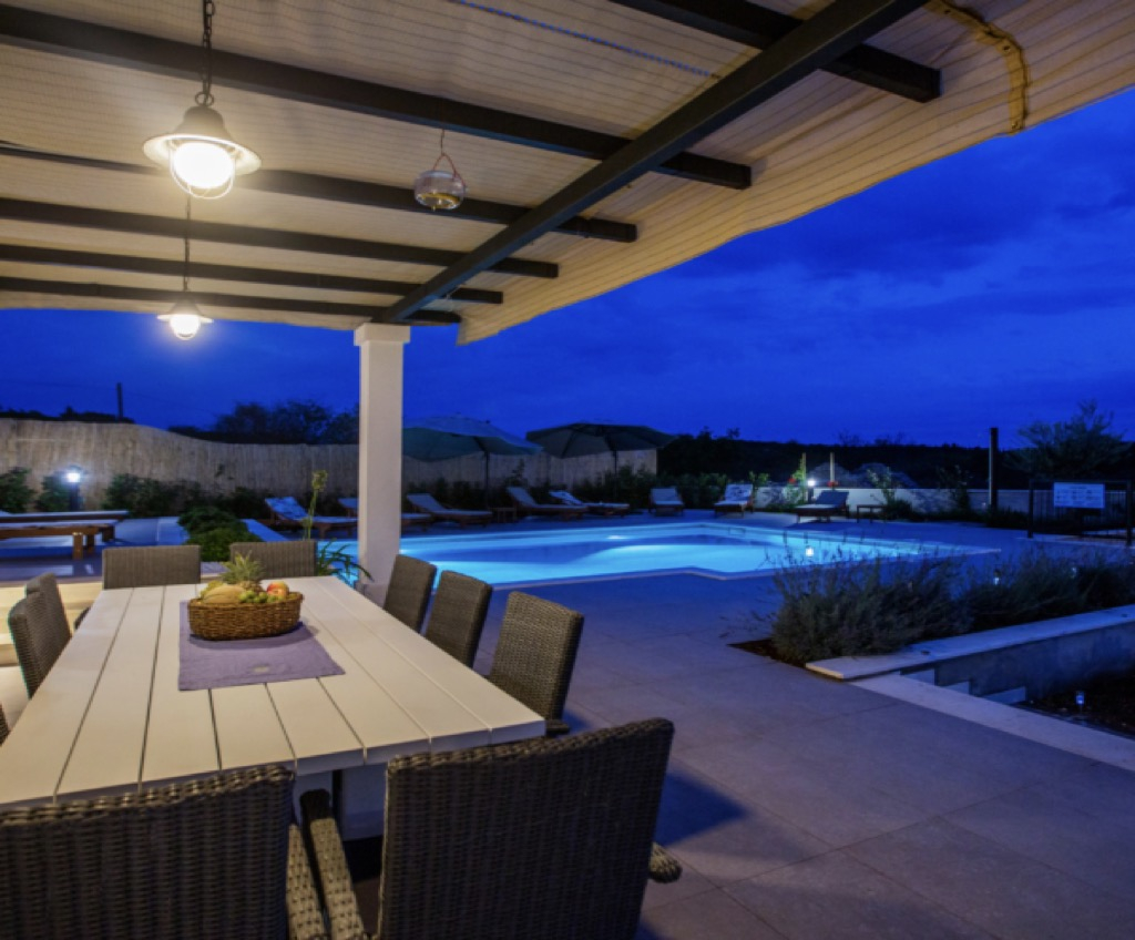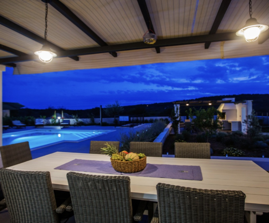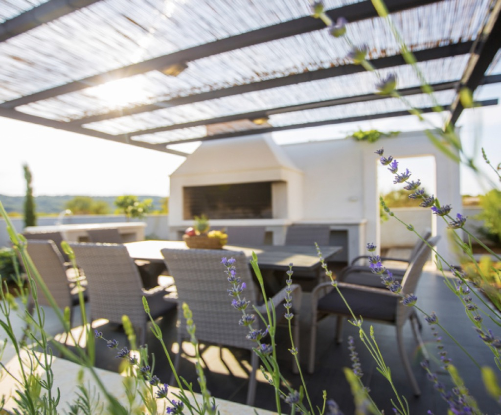 O něco dále od hlavní terasy v přízemí, která je spojena s domem, se nachází další společenská zóna s venkovní kuchyní, rovněž krytá funkční a krásnou pergolou.