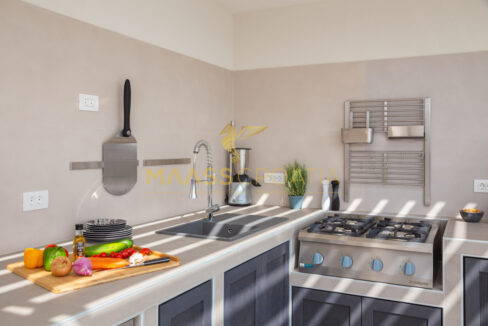 Přízemí tvoří garáž, chodba, toaleta, dvě ložnice, každá s vlastní koupelnou, velký, pohodlný obývací pokoj s kuchyní a jídelnou a vstup na obytnou terasu s kuchyní, sluneční terasou a nekonečným bazénem o rozloze 40,68 m2 a zahradou.