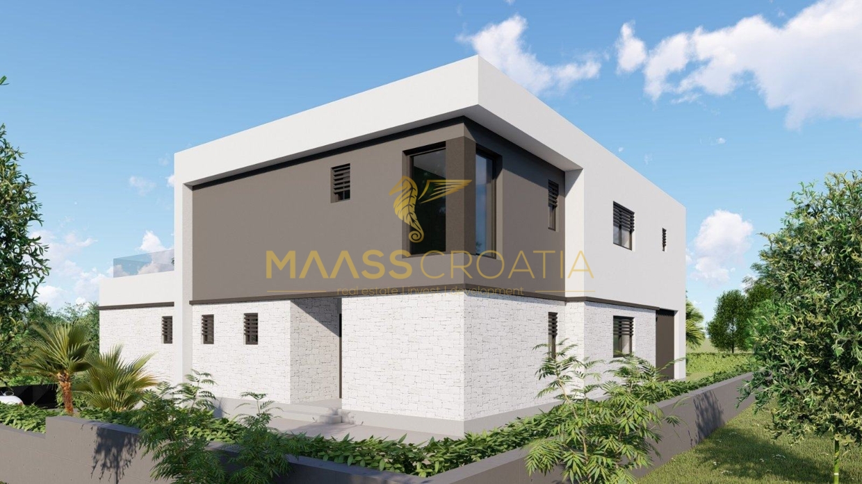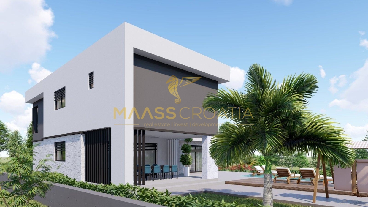 Na prodej je stavební pozemek o rozloze 260 m² s projektem luxusní vily ve výstavbě, který se nachází v Marčaně, v klidné čtvrti obklopené olivovými háji a volnou zemědělskou půdou. Vila má moderní design, nekonečný bazén, velké terasy a panoramatický výhled na Učku, Velebit a Cres.