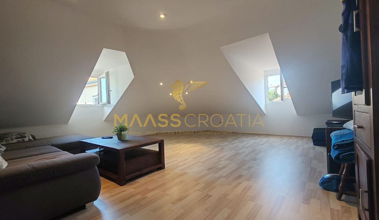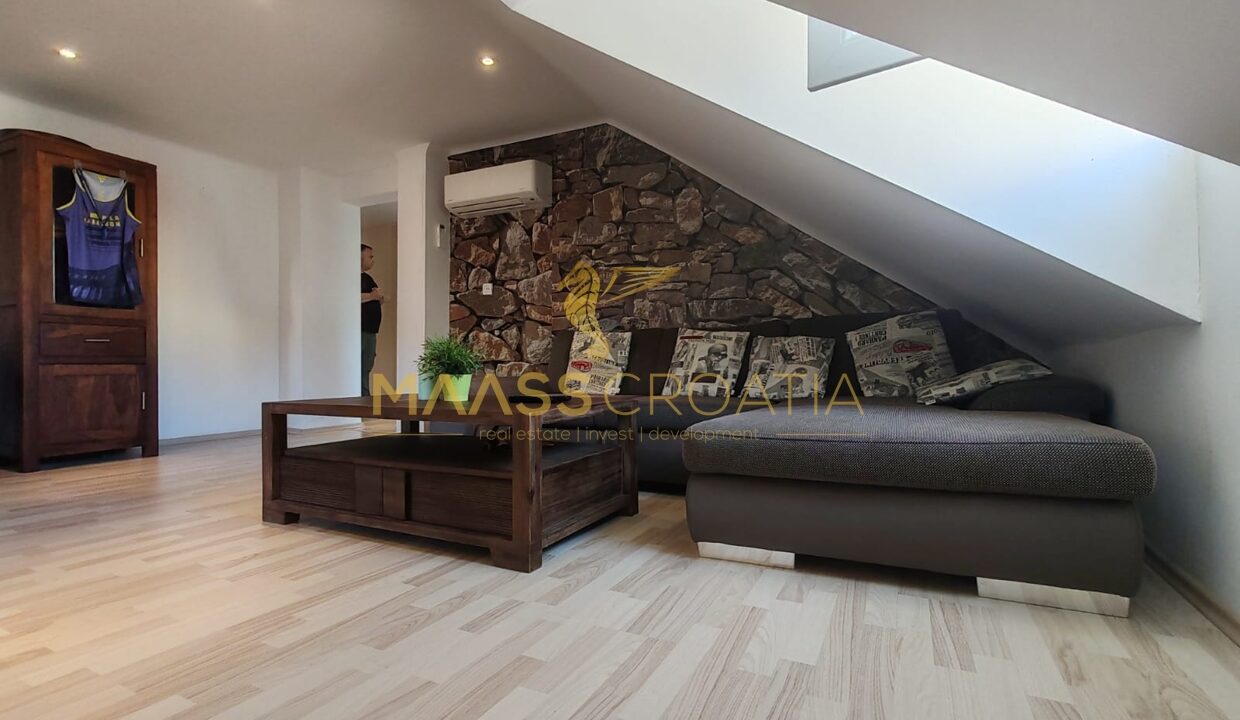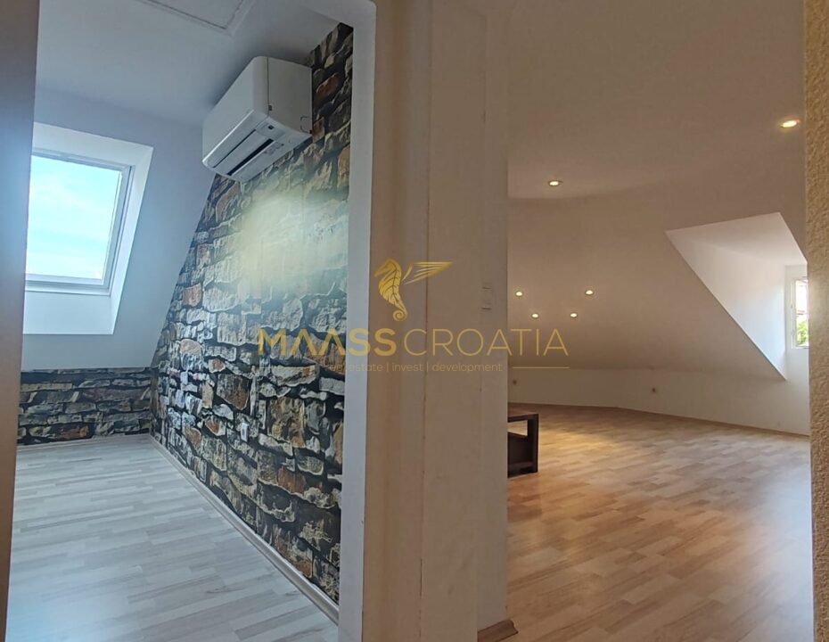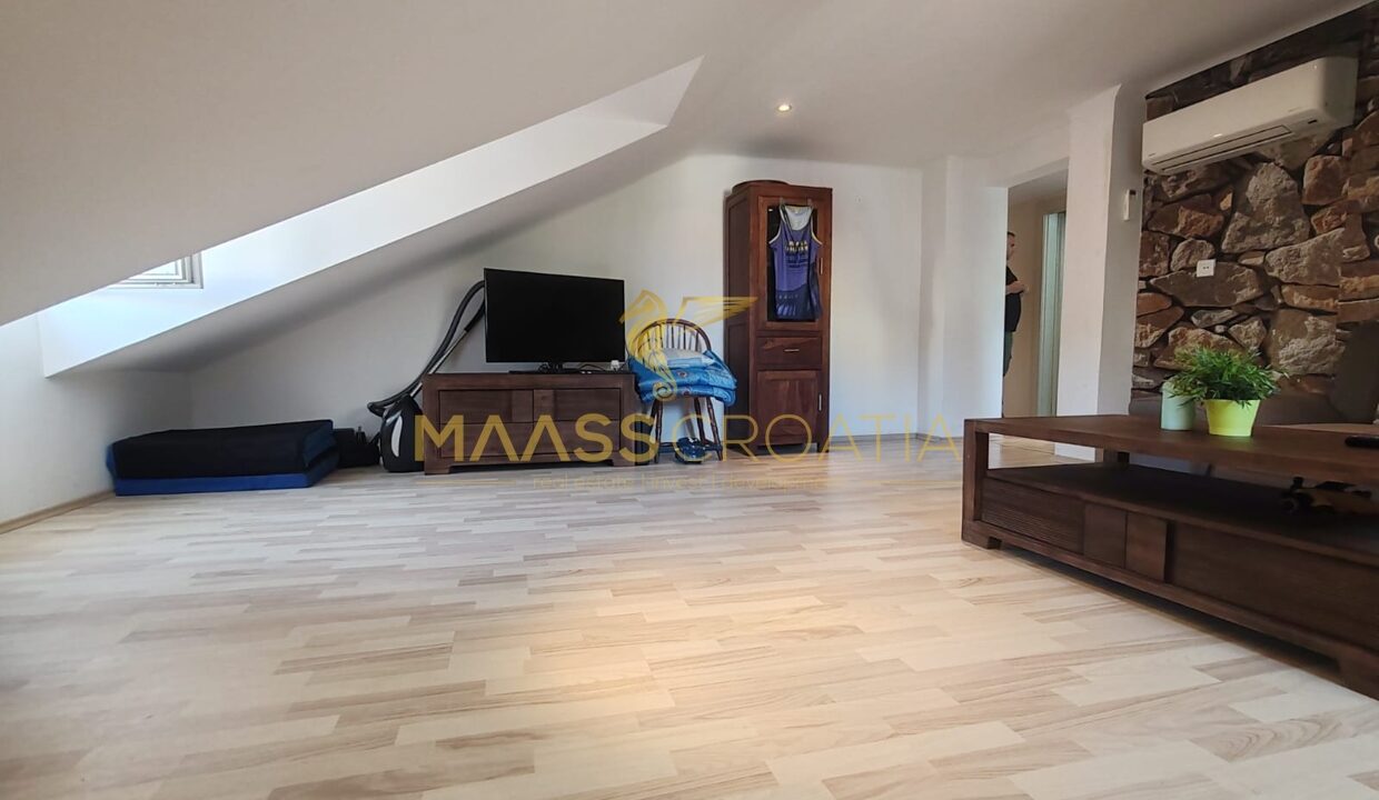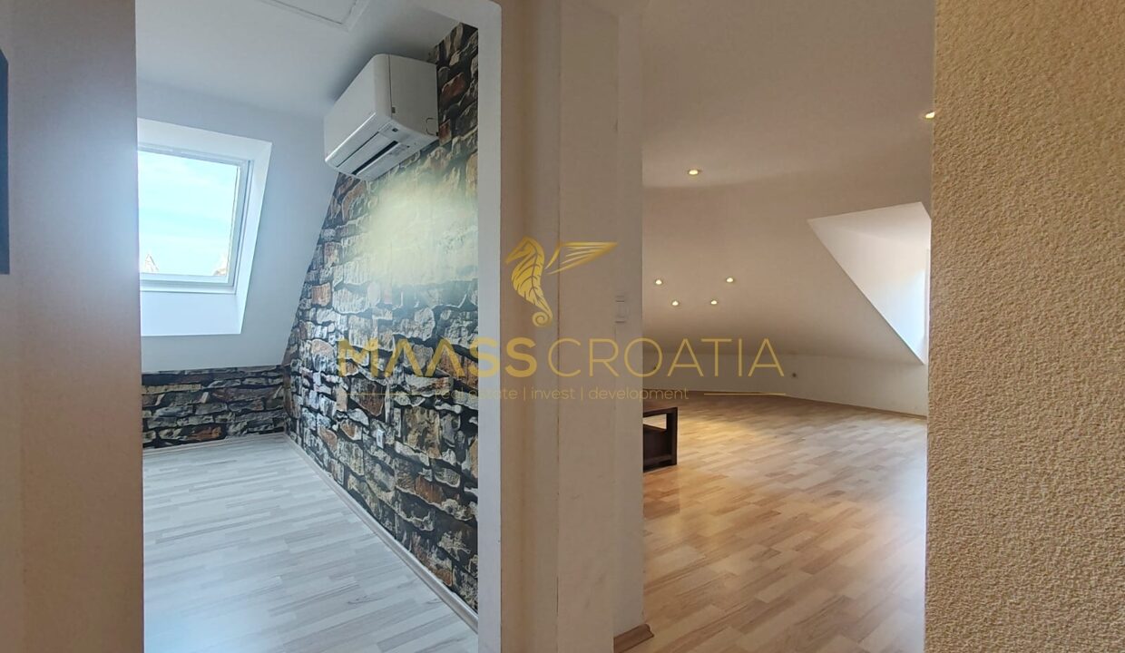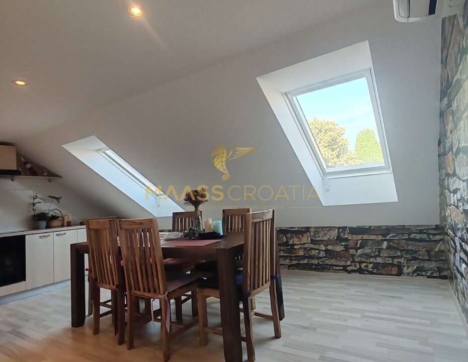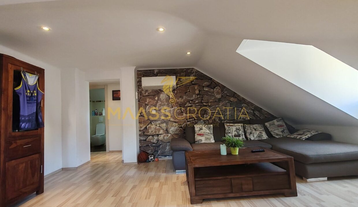 Skládá se z ložnice, prostorného obývacího pokoje, kuchyně s jídelním koutem, koupelny a komory. Je vybaven střešními okny Velux s dálkovým ovládáním, klimatizací a laminátovou podlahou v celém bytě.