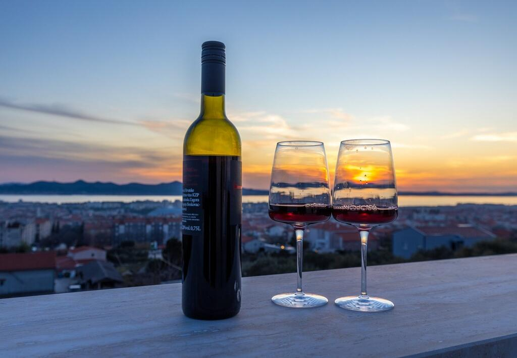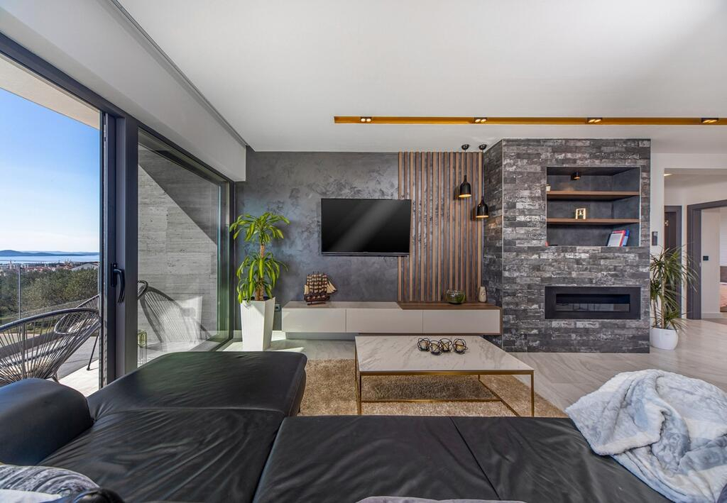Venkovní prostory jsou jednoduché, ale stylové, a díky velkému bazénu na terase v přízemí si zde můžete užívat luxusní bydlení a zároveň se nechat ohromit úchvatnými západy slunce nad Zadarským zálivem.