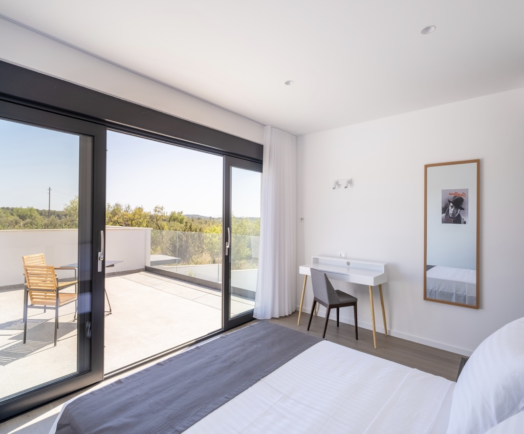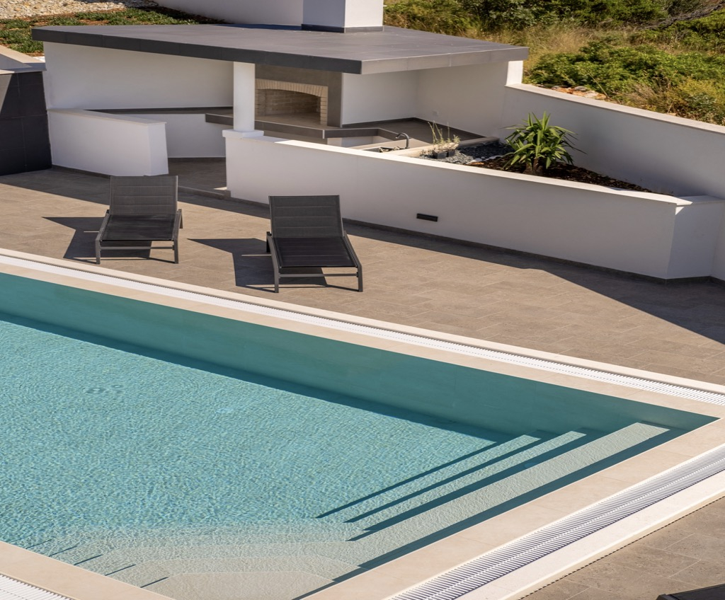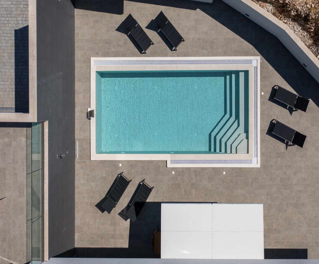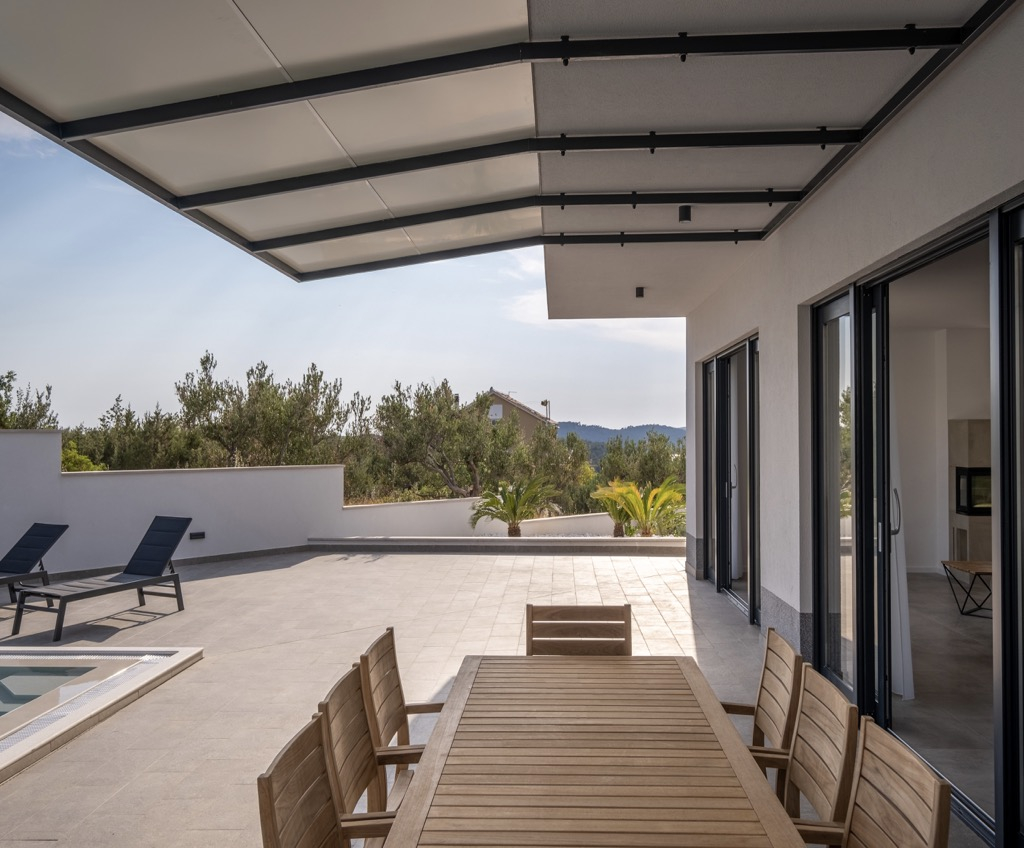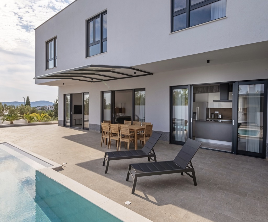 Venku před domem se nachází terasa s posezením spojená s velkým bazénem, ze kterého máte výhled na záliv.