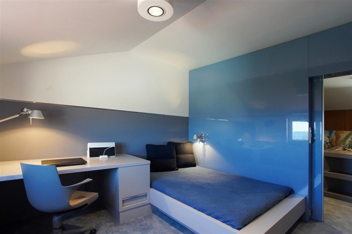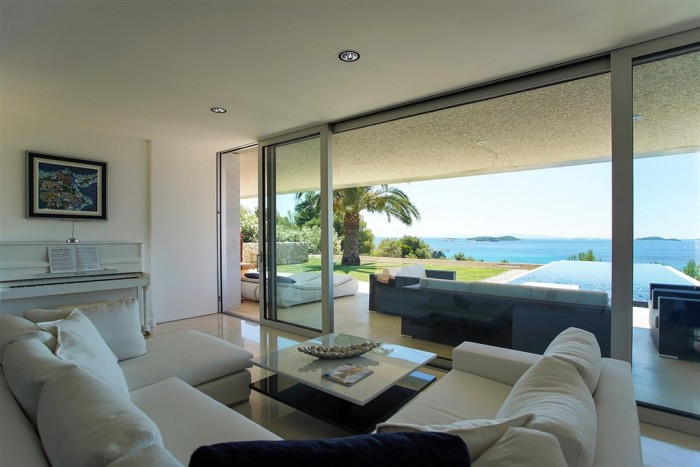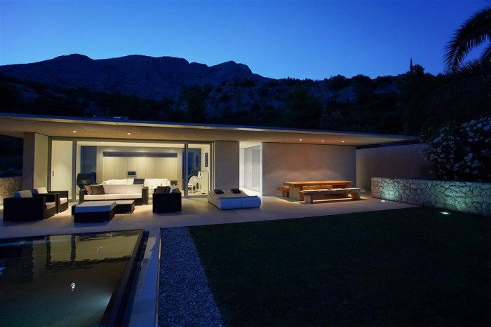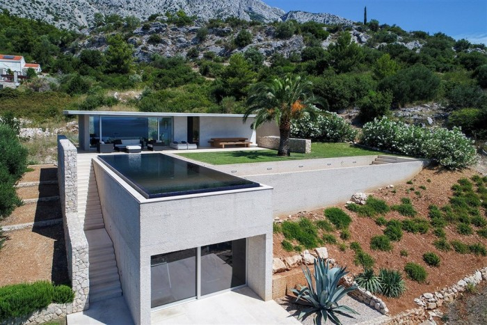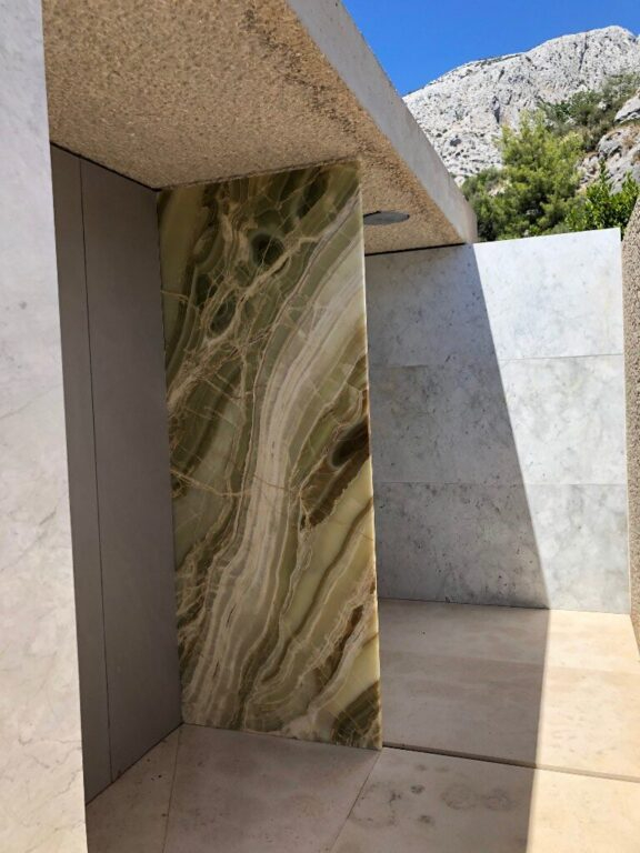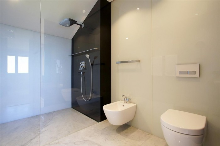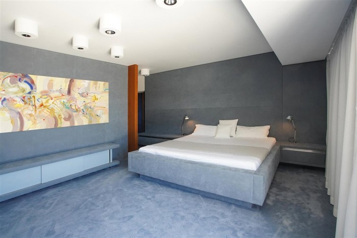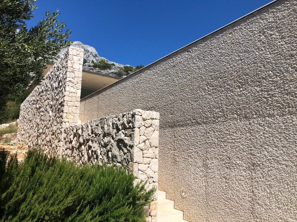 Tento dům o rozloze 480 m2 stojí na pozemku o rozloze 1720 m2. Geometricky tvarovaná a umělecká nemovitost, postavená výhradně z nejlepších a nejodolnějších materiálů, jako je beton, kámen a mramor, má celkem 4 ložnice a koupelny.