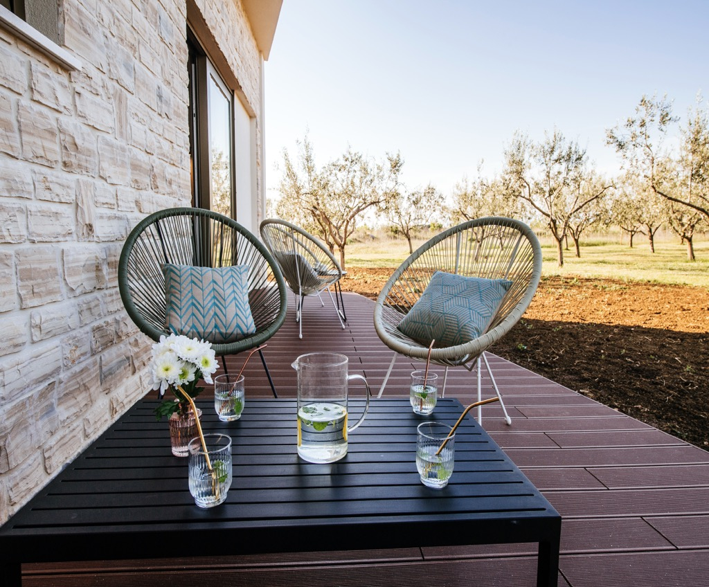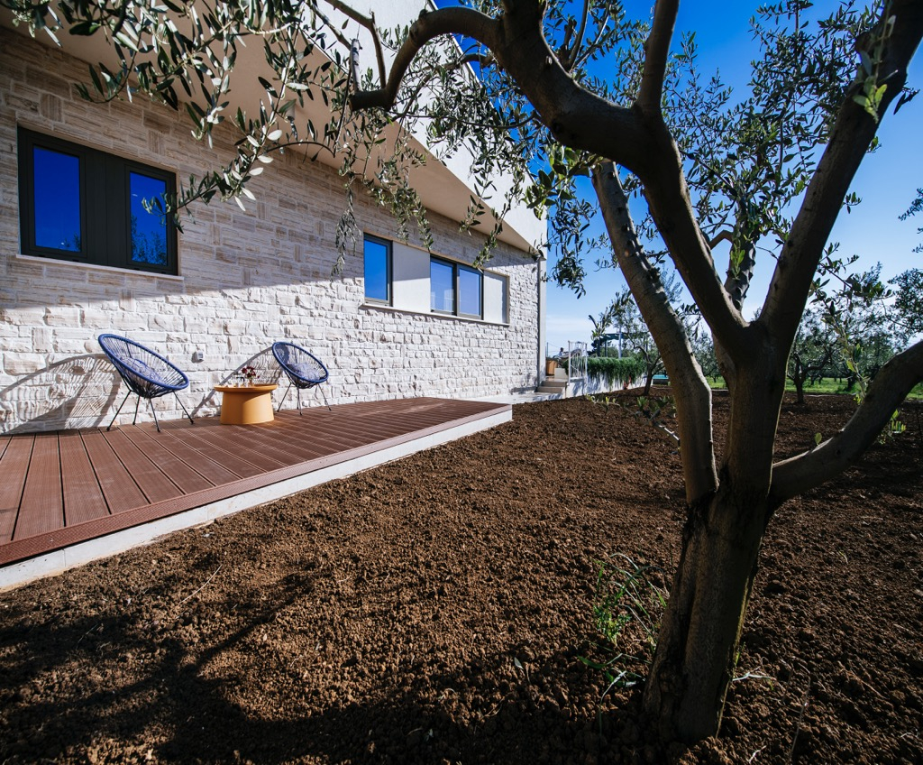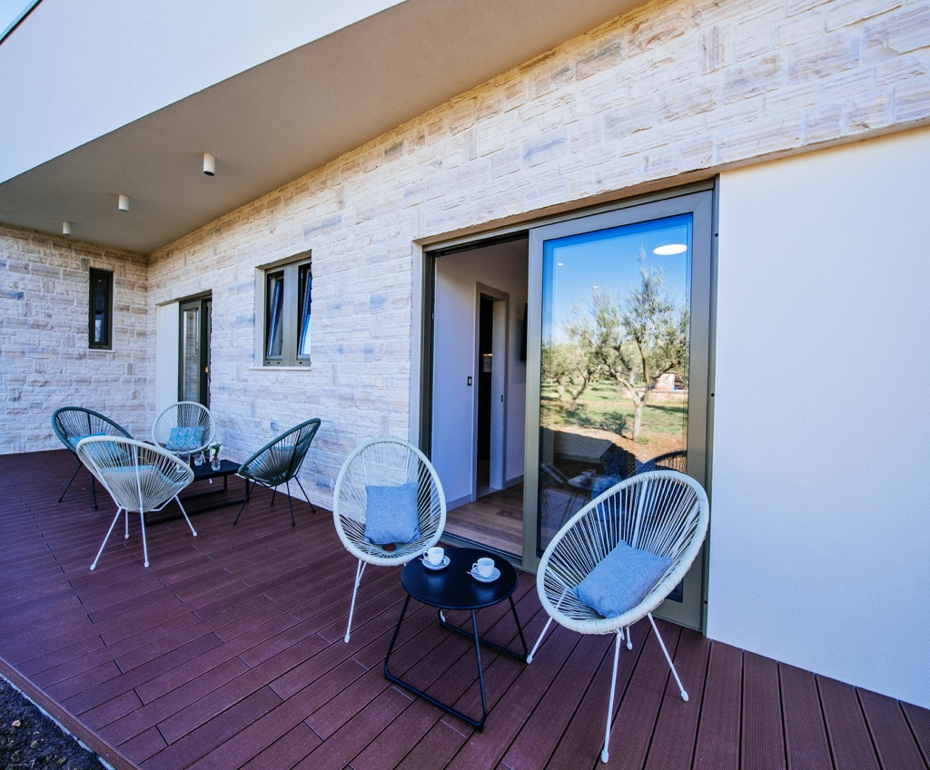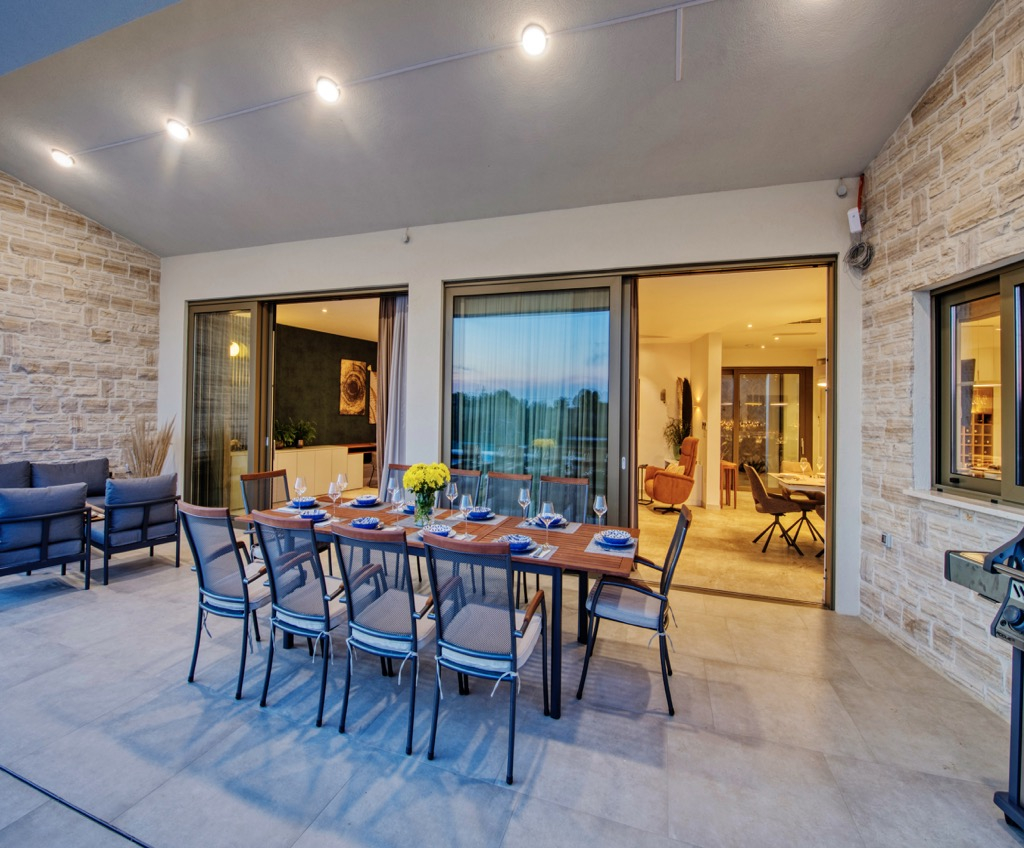 Prostorná terasa, která slouží jako společenská zóna, je propojena se samostatným domem pro hosty a harmonicky zapadá do celkového konceptu.
