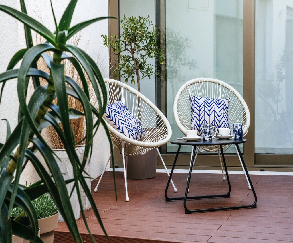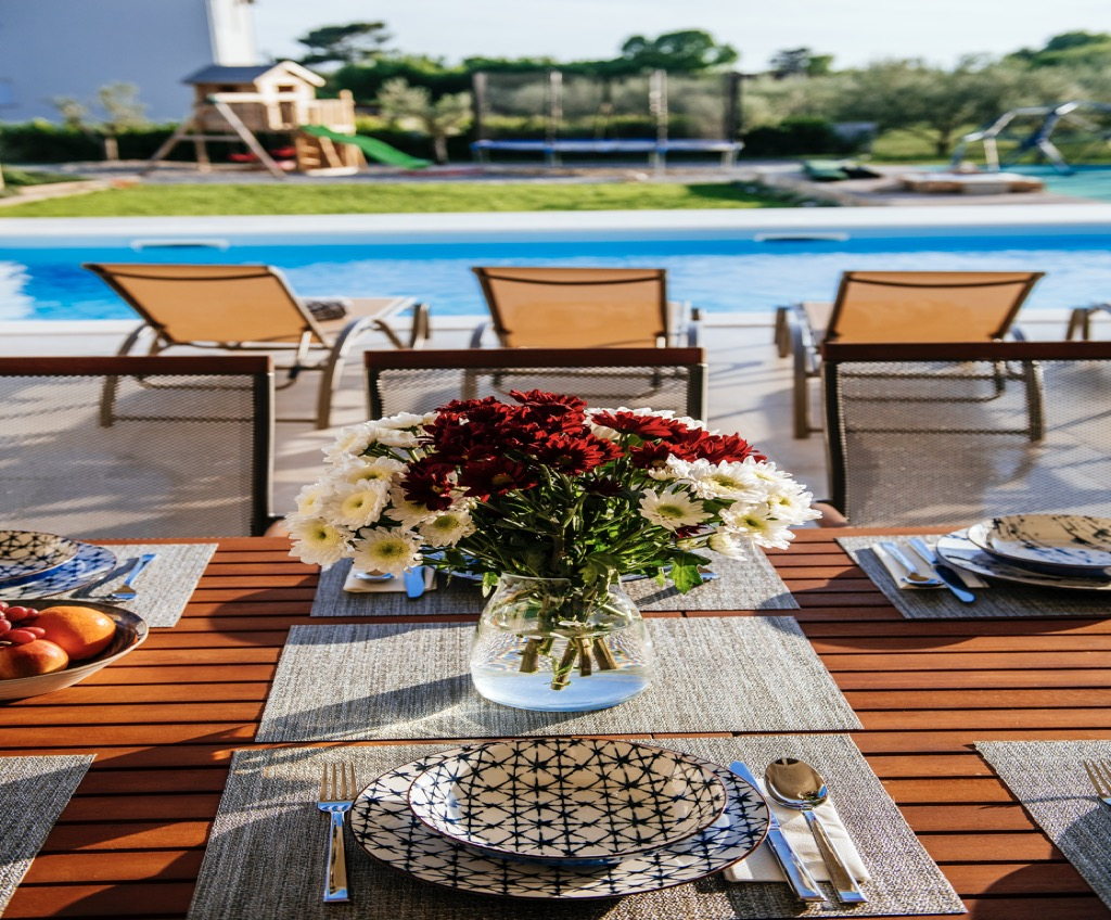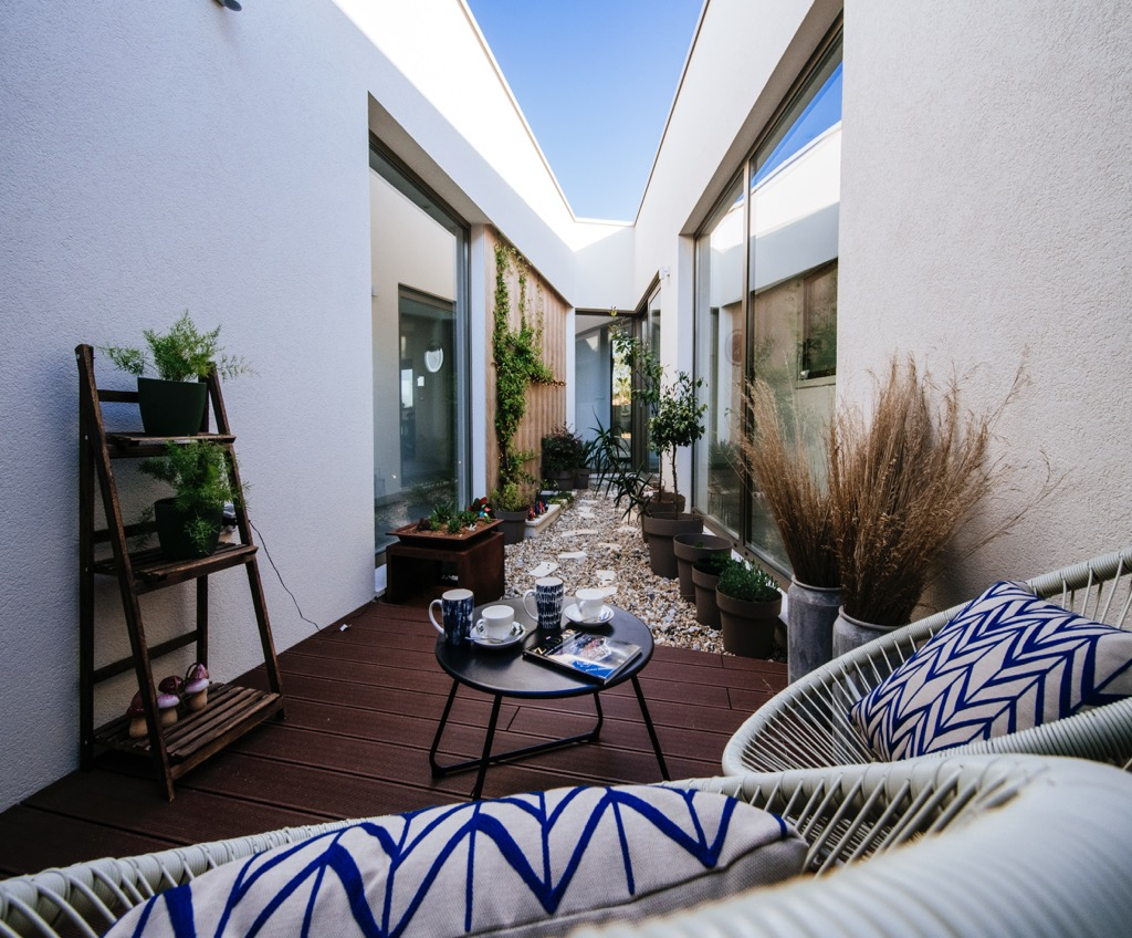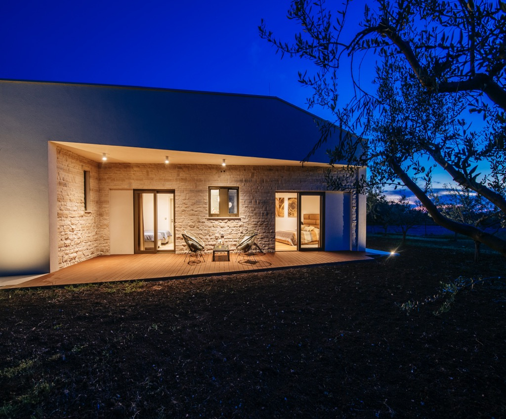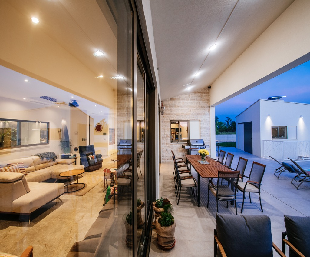 Prostorná terasa, která slouží jako společenská zóna, je propojena se samostatným domem pro hosty a harmonicky zapadá do celkového konceptu.