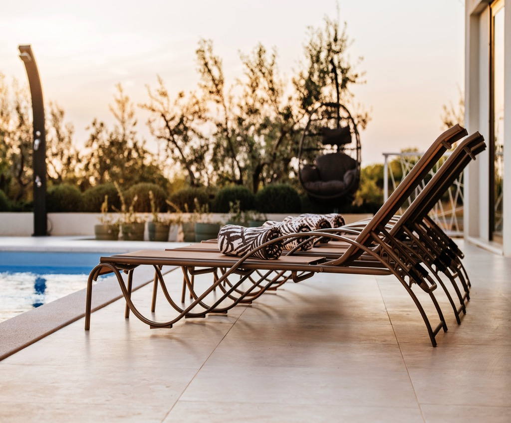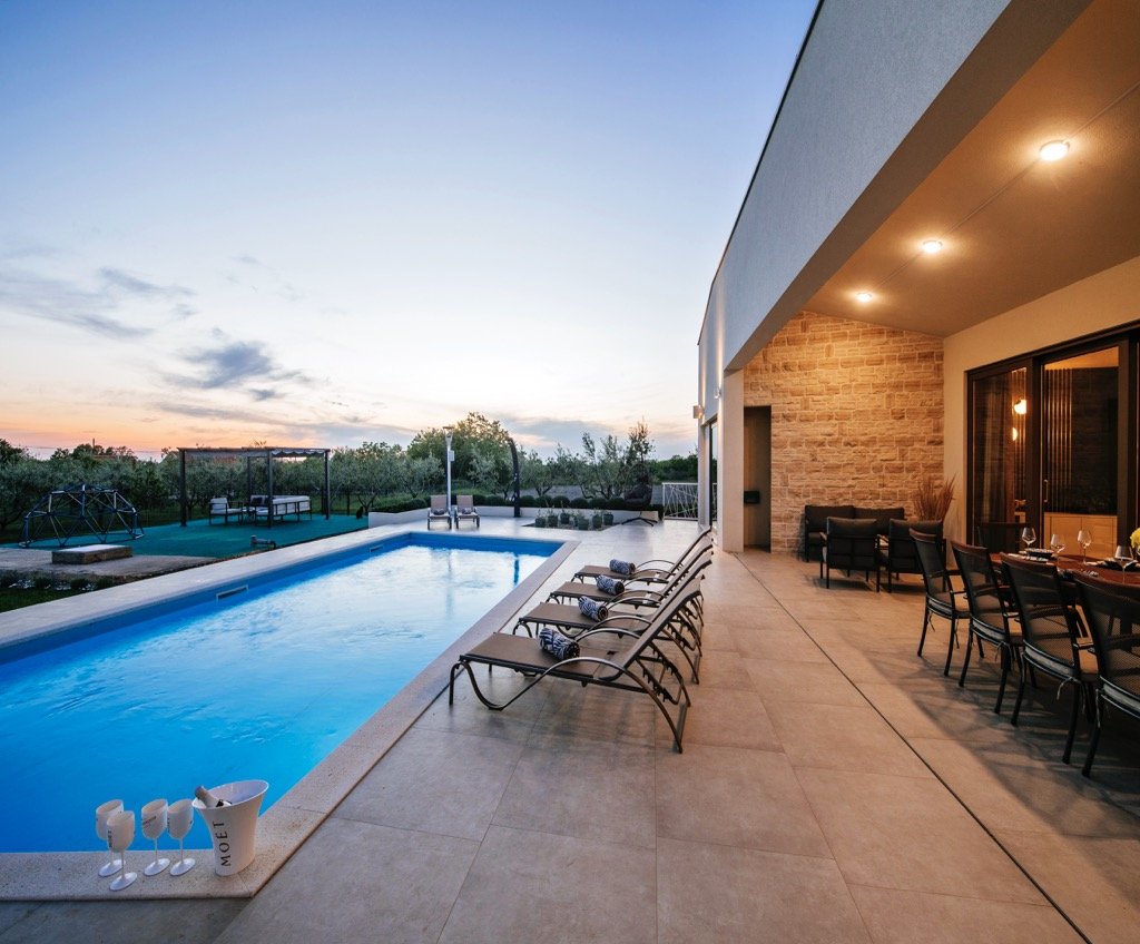 Má obdélníkový bazén na nepravidelně tvarované terase.